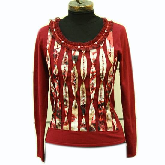 This ladies' blouse boasts irregular forms of printed patterns decorated with shinny beads. The round ruched neck adds a sense of elegance to the blouse. This fabulous blouse is a great choice for leisure time wearing.