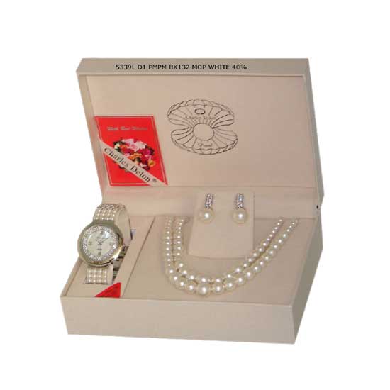 This ladies' pearl jewelry and watch set is made from lustrous white pearls. The jewelry and watch are finely designed and crafted with exquisite details. The tasteful pearl jewelry and watch set is a great gift choice for ladies on any occasion.