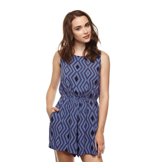 This playsuit is printed with a tribal pattern in a blue tone. The sleeveless design renders a touch of playfulness to the playsuit. This playsuit is best matched with a pair of strappy sandals.