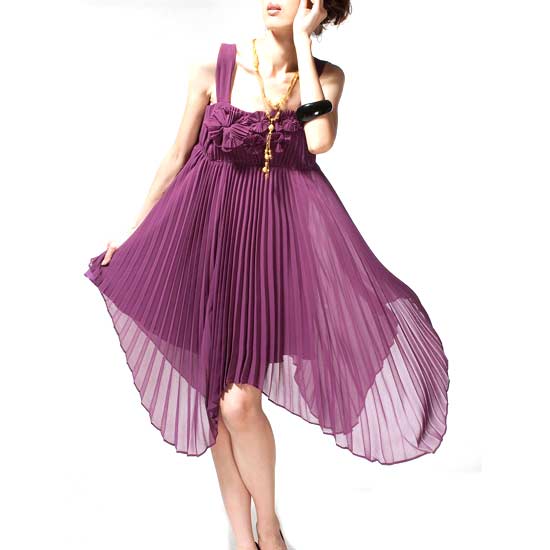 The ladies' chiffon pleated dress boasts wide straps and a ruched bodice with pleated flowers and ribbons. The irregular bottom showcases a flattering touch. Mesmerize everyone with your every movement in this pleated chiffon dress.
