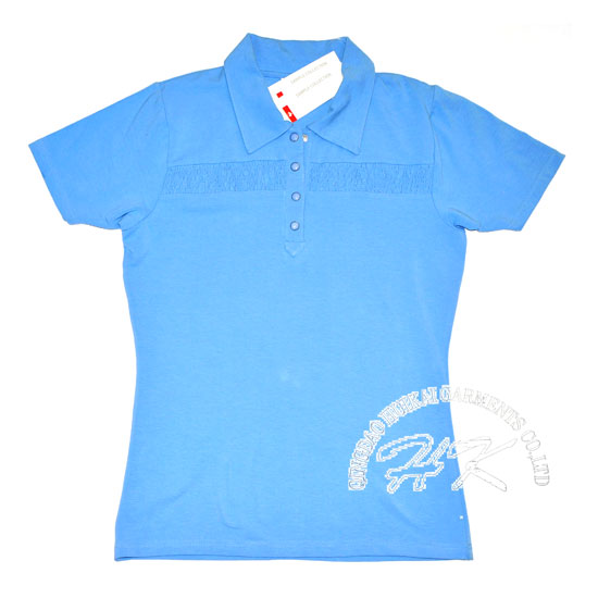 The ladies' polo shirt features a brief solid light blue design. The top of its bust is trimmed with a special wrinkled stripe. This piece makes an ideal complement to any casual combinations.