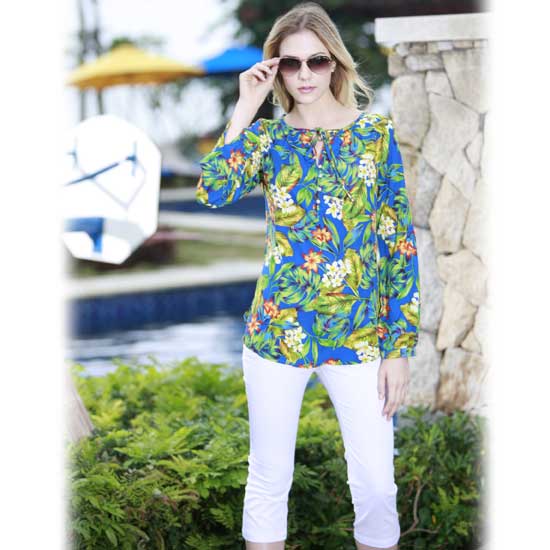 This ladies’ long-sleeved blouse features greenish leave and floral patterns on the blue background. It is designed with a drawstring on the neckline for a feminine touch. This smart and bright blouse goes great with a pair of white pants.