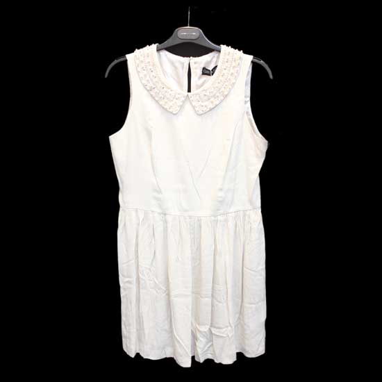 This ladies’ polyester dress comes with a solid white hued design for a pure and simple style. The beaded Peter Pan collar accentuates the dress exuding a cute touch. This sleeveless dress makes a fabulous addition to your summer wardrobe.