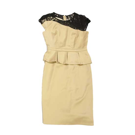 This ladies’ dress features a black lace design on the shoulder and a light colored body for a contrasting look. It comes with ruffles at the waist for an added feminine touch. This decent one-piece dress is fabricated from polyester.