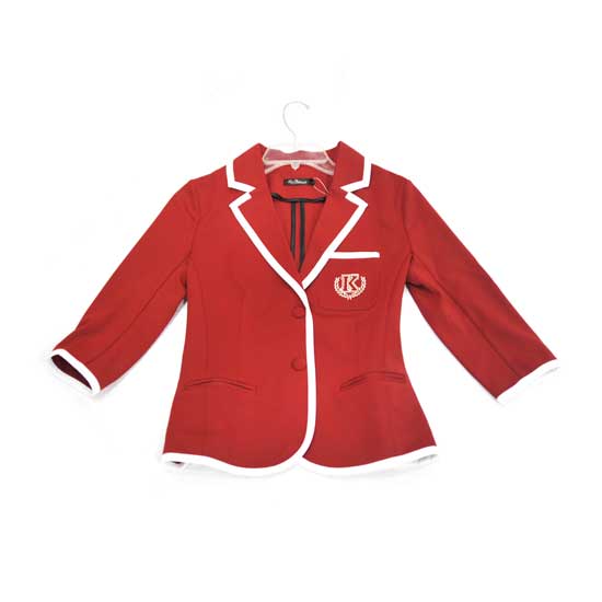 This fashionable jacket for ladies features a red toned appearance with white edges for a contrasting look. It comes with a notch collar, a two-button front closure and multiple pockets. The exquisite pattern on the chest pocket highlights the design easily.