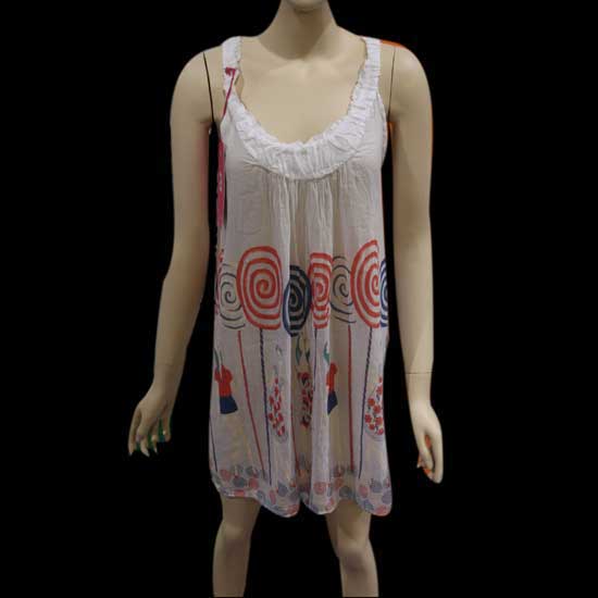 Featured here is a sleeveless dress with a ruched round neck. The multicolor lollipop prints give a chic and casual touch. This printed sleeveless knitted dress makes a great addition to your summer wardrobe.