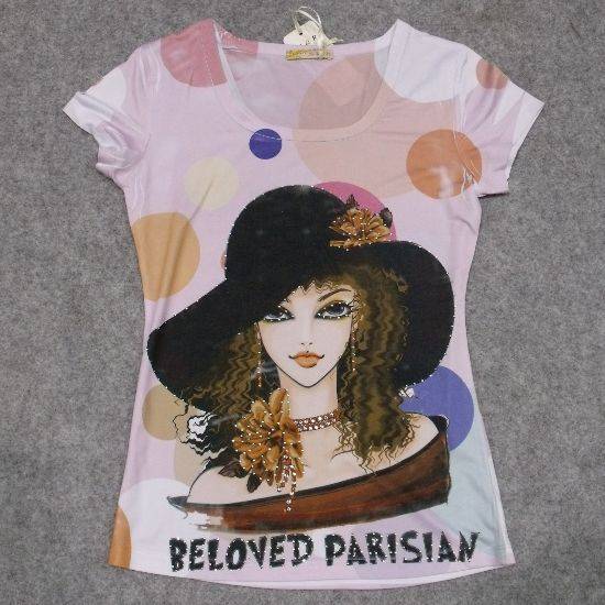 This chic T-shirt features a round neckline and short sleeves. It is made of good quality printed fabric with colorful dots in various sizes. The front is printed with a charming French girl wearing a stylish hat. The English characters "BELOVED PARISIAN" right above the hem are decorated with sparkling crystals. It looks ultra great with a slim cutting. It is an ideal piece to match with jeans for young ladies.