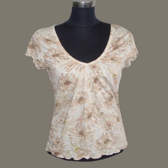 The elegant short-sleeve T-shirt comes with a slightly curved and gathered V-neckline. It features vivid floral prints made by reactive dye printing technique in peach yellow throughout for additional vogue. Also embellishing the T-shirt is the ruffled trim at the cuff-lines and hemline. Finely tailored with a loose-fit cutting, it fits a variety of body shapes.