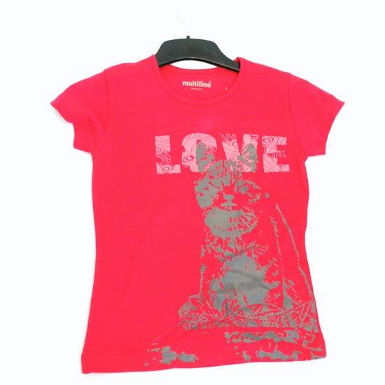 This ladies' T-shirt features a round neck and short sleeves. The body is printed with a word in a fancy style and a lovely cat print on the left. The easy-fit T-shirt makes an ideal item for summer.