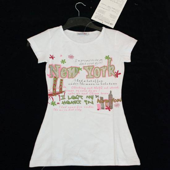 This ladies' T-shirt features a long cut with an A-line bottom. The front is lushly printed with glittering words and messages in graffiti style. The floral patterns and landmarks make appealing embellishment.