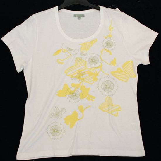 This ladies' T-shirt comes with tender patterns of abstract shapes and silhouettes. It comes with a round neck for comfortable sensation. This short-sleeve casual wear item makes a nice addition to the summer wardrobe.