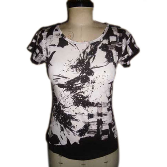 This ladies' printed T-shirt features eye-catching abstract patterns. It boasts a comfortable construction and a flattering cut. This round neck T-shirt is a chic and urban garment suitable for a relaxing day in the countryside.