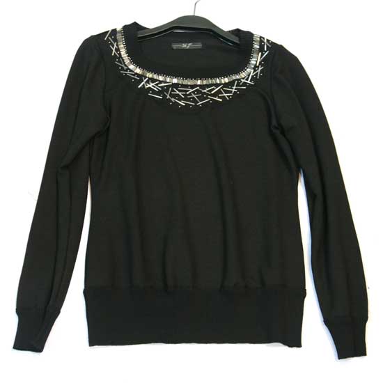 This ladies' pullover features a pair of long sleeves with ribbed cuffs. The square neck is embellished with beaded detailing to shine in an unfettered style. This pullover simply showcases a chic and charming style.