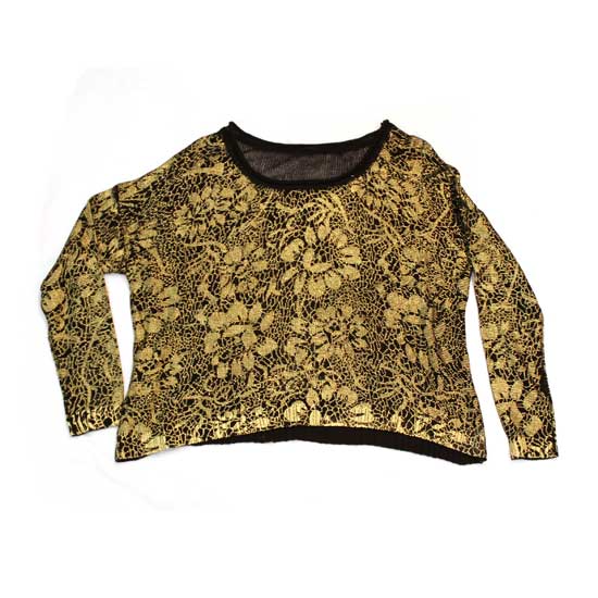 This is a ladies' pullover that is made with a classic round collar and long sleeves. The allover golden-toned floral patterns add extra elegance to the look of this pullover. The 100% cotton construction ensures gratifying wearing comfort.