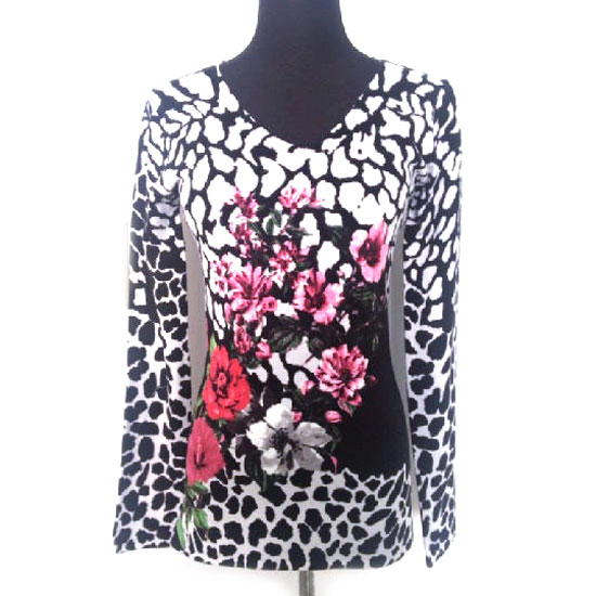 This is a stylish ladies’ pullover with a V-neck and long sleeves. It is made of quality materials for a comfortable touch. This ladies’ pullover is designed with delicate prints and embroidery details for an eye-catching look.