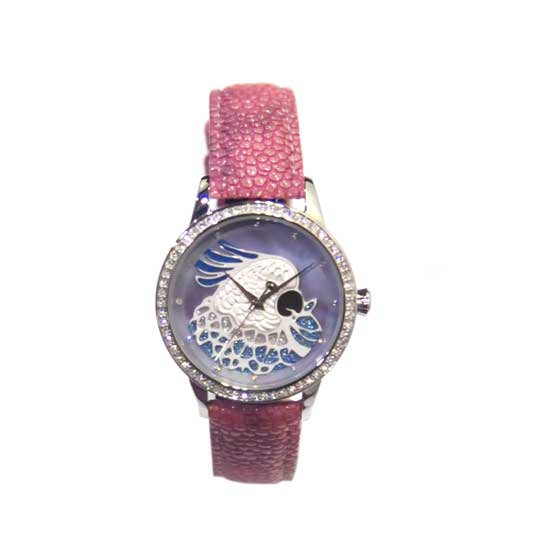 This quartz analog watch for women is ornamented with Swarovski stones and MOP for a fancy look. It is equipped with a pink leather strap with cracking patterns. This dazzling wristwatch is a great complement to your outfits.