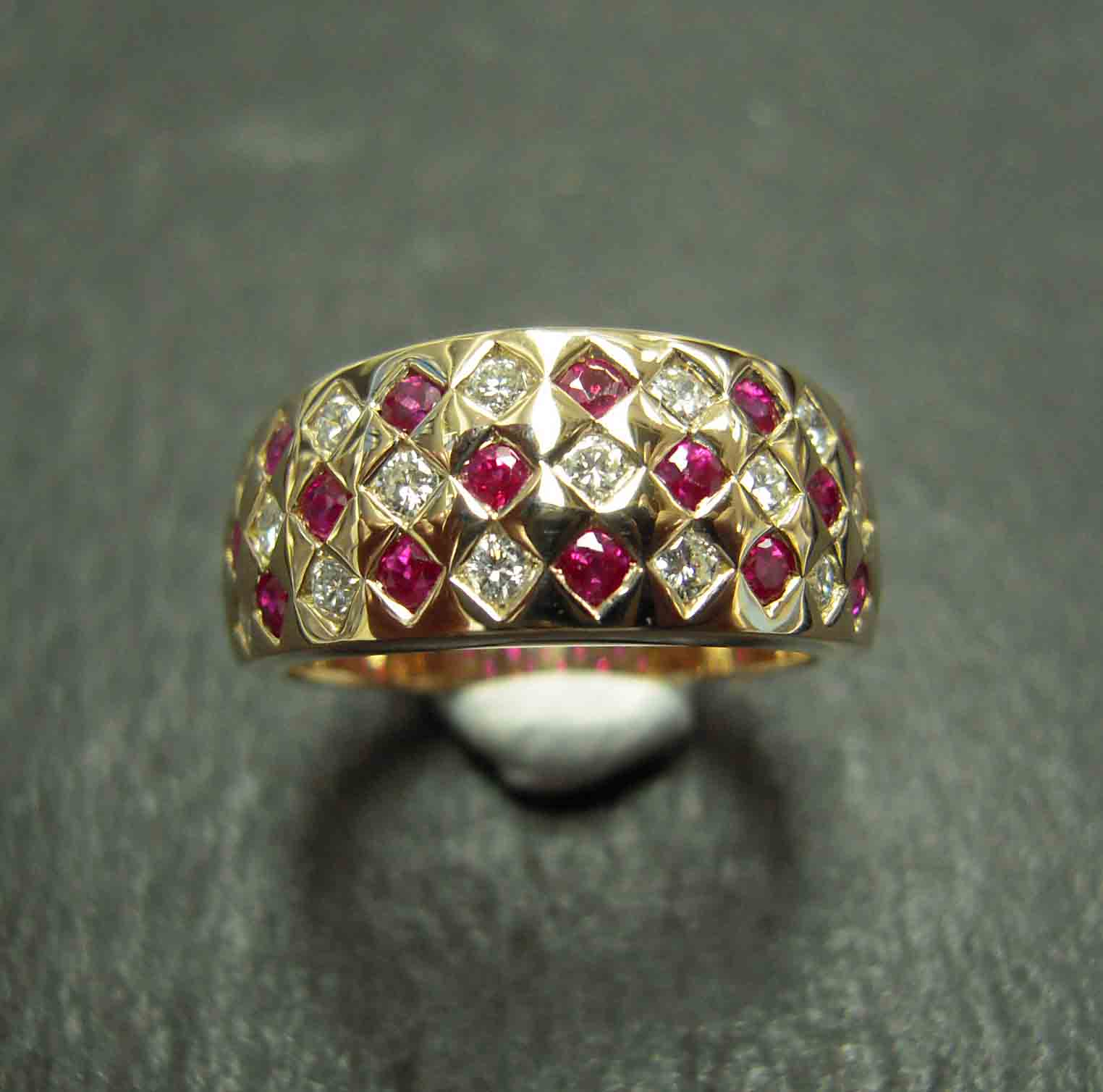 This multi-gemstone ring has a dazzlingly ornate design. It is made of 18-karat yellow gold, highlighted with sparkling rubies and diamonds. This fabulous ring is a stylish choice to flatter your everyday look.
