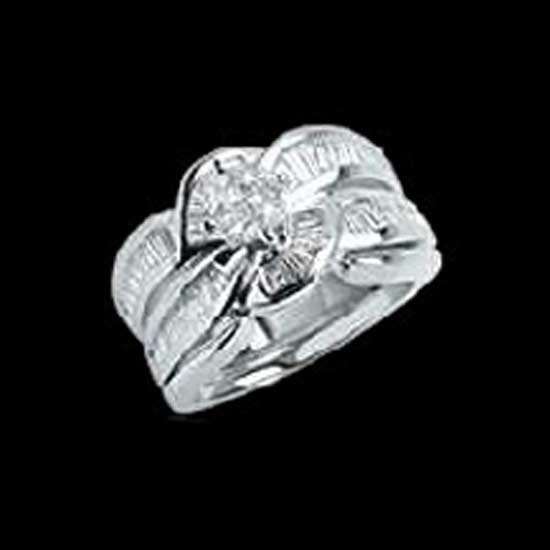 This extravagant ring features a ribbon design with a knot at the center. The wide band has shimmering stones all along, giving the ring a sleek, modern look. This stunning ring is the epitome of elegance.