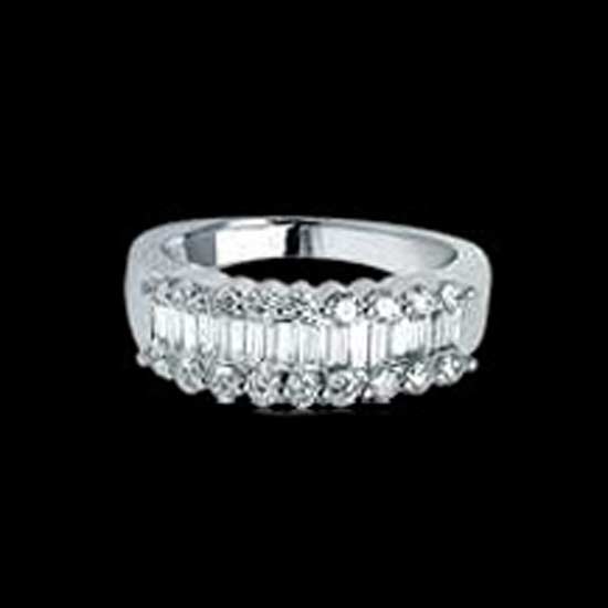 The breathtaking ring features an upper shank embedded with two rows of round gleaming stones. The central part showcases dazzling stones with an emerald cut. Do not disappoint those who consider you the hallmark of fashion with this stylish ring.