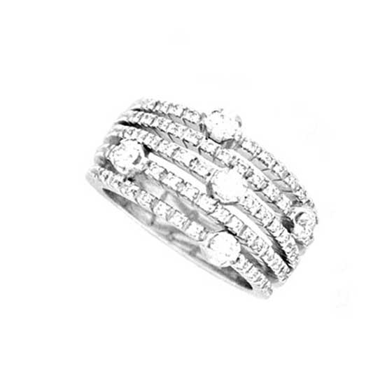 This dainty ring features five bands with round stones embedded in different positions. The band itself is also embellished with a princess-cut stone, adding beautiful accents to your unique style.