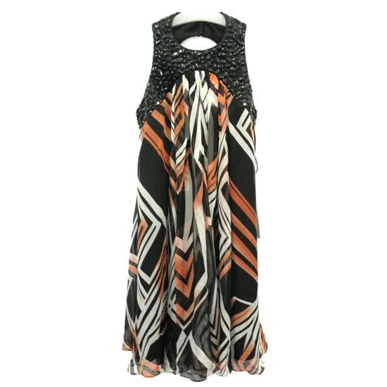 The sleeveless silk dress boasts a beaded bodice, showcasing some ethnic charm. The flowing geometric-print dress finishes the look with flattering texture. Add style to your spring collection with the printed silk dress.