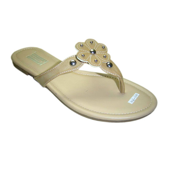 Showcased here is a pair of ladies' sandals in beige. A studded floral ornament is designed on the strap. These simplistic, comfortable sandals can be worn with jeans, dresses or skirts in summer.