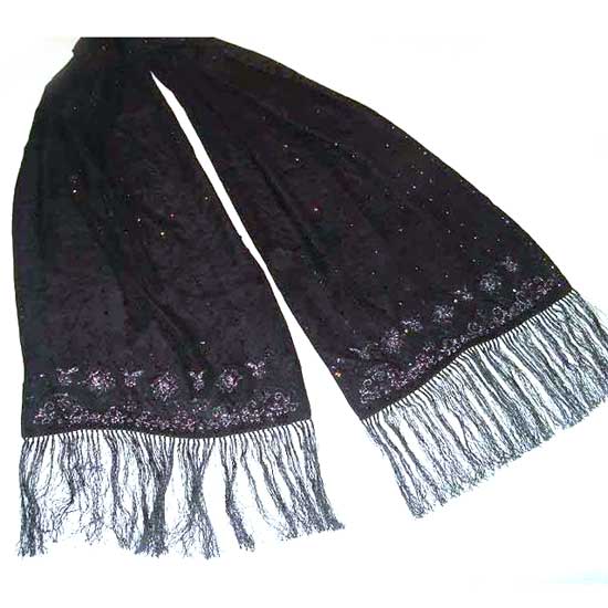 This ladies’ scarf is designed in all black to exude a sophisticated style. Pink decoration is added along the two ends in a subtle way. The long fringes are added as a perfect finish to the design.