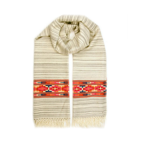 This is a hand woven ladies' scarf with striped and folk patterns. The scarf is made with the traditional weaving techniques and tools. The yarn is made from local mountain sheep, goats and yaks to offer ultimate insulation.