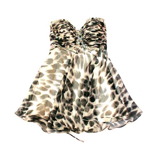 This is a ladies' short evening dress boasting a sexy and eye-catching design with a heart-shaped neckline. Its bodice is crafted with allover pleats and adorned with colorful crystal elements. This dress comes with a mono-color print for added style.