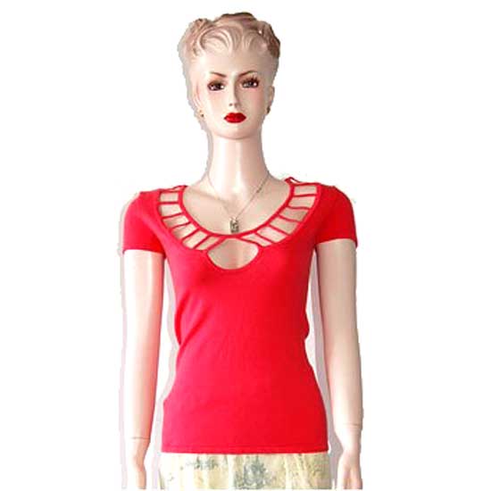 The ladies' short-sleeve blouse boasts a crochet-inspired neck for a flirtatious touch. It is soft and stretchable for incredible comfort. Update your wardrobe with this plain short-sleeve top for easy mix and match.