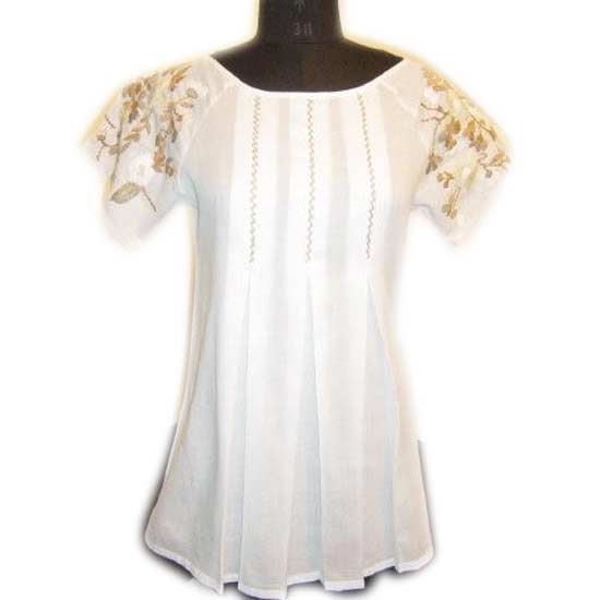 The blouse has a round-neck and short sleeves. The embroidered sleeves add a decorative touch. This blouse is great to wear on vacations.