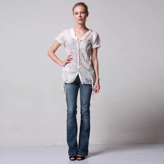 The ladies' blouse has short sleeves and a V-neck. The strings hanging down from the neckline and bottom add a stylish touch. This blouse goes best with casual bottom such as jeans.