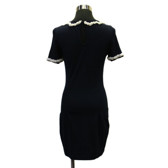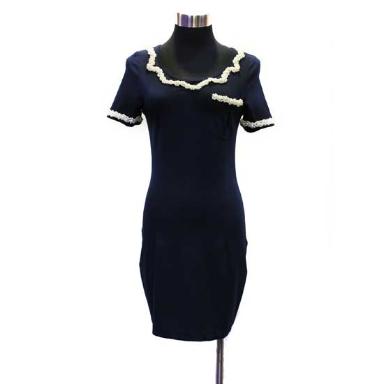 Showcased is a ladies' short-sleeved dress with a scoop neck for a relaxed yet graceful style. The lustrous beading at the collar and cuffs flaunt strong elegance. This dress simple adds a gorgeous touch to the wearer.
