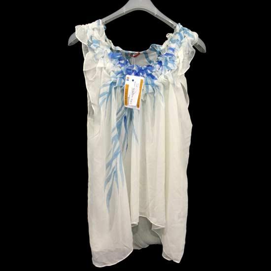 The sleeveless silk blouse boasts a ruffle bodice for a bubbly touch. The blue leaves patterns showcase a relaxed silhouette. The delicately ruffled silk blouse will look feminine and elegant on you.