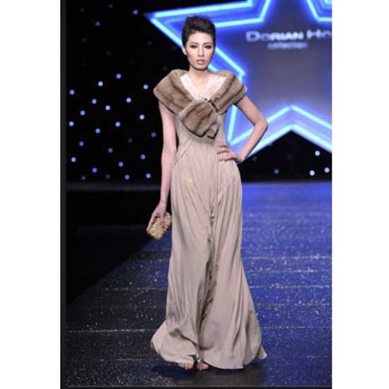 The ladies' evening dress is made of silk crepe-de-Chine with asymmetrical ruched detail. It features a form-fitting design to flatter the lady's figure. This evening dress is a great outfit pick for attending dinners and banquets.