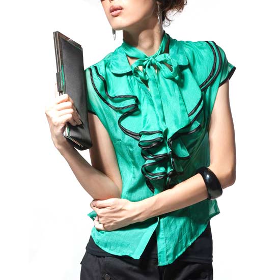 The ladies' silk blouse boasts layered ruffles with accent trimming, showcasing vintage flair and elegance. The self-tie ribbon collar adds a chic touch. This sleek ruffle blouse is the perfect choice for work and parties.