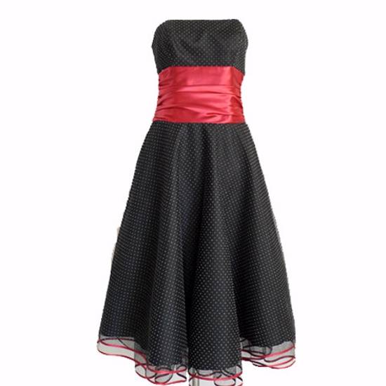 The black dress is adorned with minute white polka dots.