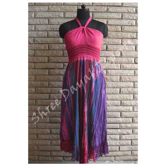 The ladies' dress features a smocked waist. The tie-dyed skirt is styled with a pleated construction, showcasing a rich ethnic tinge. Showcase your personality with this flattering halter dress.