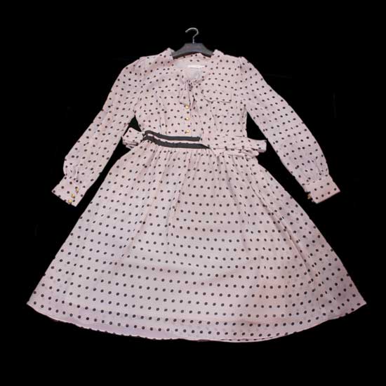 This pinkish spotted dress features a self-tied bow neckline and a golden button front bodice. The belt design at waist can be used for decoration or adjusting different fit. This long-sleeved dress makes an excellent piece for ladies.