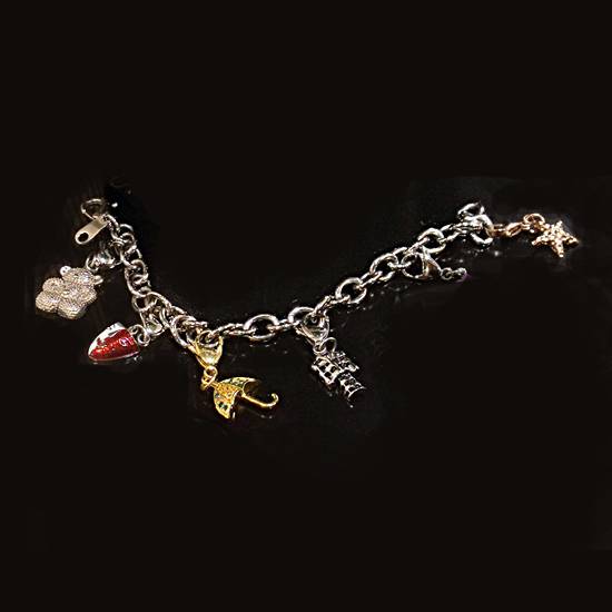 This stylish bracelet features a stainless steel chain with several delicate pendants. It comes with a lobster buckle. The pendants are embellished with gleaming crystals to showcase a feminine detail. It is an ideal item for matching with elegant dresses.
