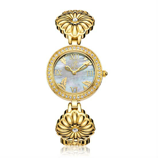 The pictured watch is an extravagant expression of aesthetic beauty. The allover sleek gold-tone wristwatch comes with a bezel filled with clear toned Swarovski stones for luxurious appeal. Exquisitely styled in a design of flower petals, the delicate watch band will present as a gorgeous floral bead bracelet on any lady’s wrist.