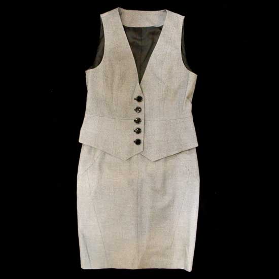This featured set of ladies’ suit offers a modest yet popular design. The suit is made to fit feminine figures. The short-sleeved vest makes it easy to match a number of blouses.