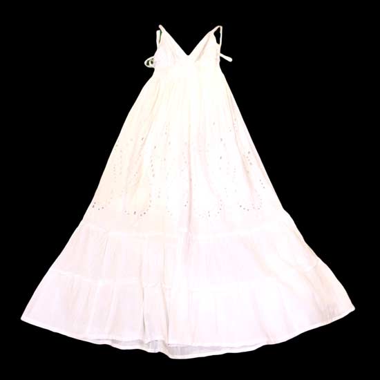 The plain sundress boasts self-tie spaghetti straps and a V-neck, showcasing a feminine silhouette. It is elegantly finished with a flared and airy full-length bottom. Complete your wardrobe with this pure cotton dress.