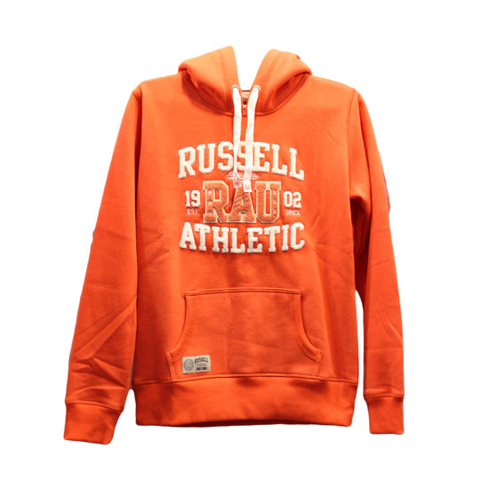 This is a ladies' sweat shirt in bright orange. It features a hood with a white rope and a pocket. The sophisticated words on the front add a touch of style to this design.