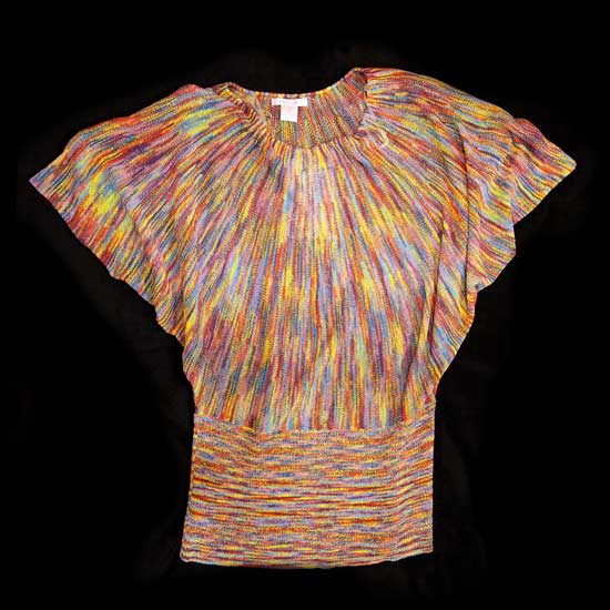 This eye-catching ladies' sweater features multi-color construction. The sweater is accented with batwing sleeves and a slimming waistline. This trendy sweater makes a great addition to any lady's wardrobe.