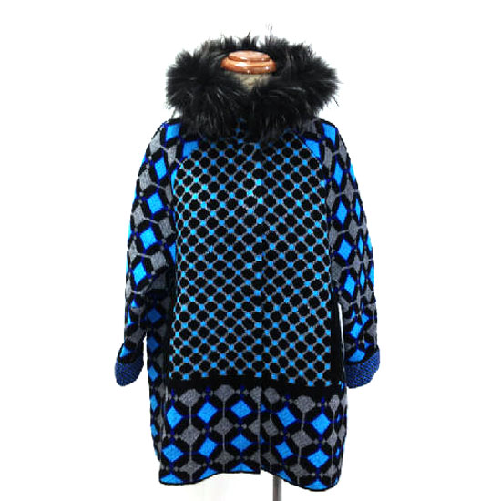 This is a ladies' sweater coat with a fashionable and attractive design. It comes in colorful and eye-catching patterns for added style. The fluffy fur hood completes this design for a perfect finish.