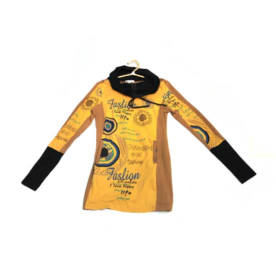 This ladies' sweatshirt is accented with unique letters and prints on the background of yellow. The hoodie collar with a drawstring closure offers extra warmth. The long sleeves and two side-entry pockets complete this practical sweatshirt.