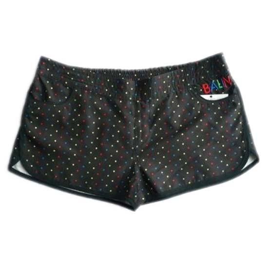 These swim shorts feature a waterproof layer for water sports. They are black in color with colorful dotted patterns. This fashionable design goes well with a range of tops or swimsuits for a beach look.