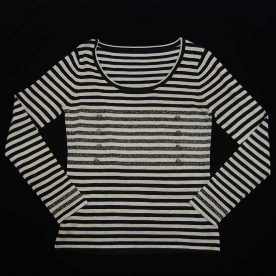 This round-neck ladies' T-shirt is horizontally striped in black and white for a nostalgic look. Its nylon and spandex construction is woven for superior elasticity. This T-shirt is a fancy piece to match winter apparel.