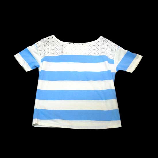 This ladies' short-sleeve T-shirt is accented with blue and white stripe patterns. The sheer lace shoulder panel adds an elegant and feminine touch to the piece. The trendy T-shirt will add style to your summer look.